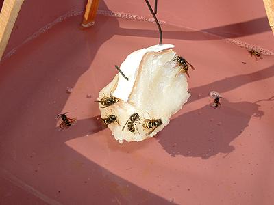 How It Works: The yellow jackets love fish and will begin to cut off small pieces to take back to the nest. In their "excitement" of buzzing around the bait a few will occasionally hit the water. The soap in the water breaks the surface tension of the waterproof coating on the yellow jacket and it instantly sinks in the water and drowns in a few seconds. Some yellow jackets will successfully haul a piece of meat back to the nest and tell all the other gatherers in the nest where this great food source is. Soon all the wasps from the nest will be working on this fish and over a period of time, all will eventually make mistakes and either fall off the fish and into the water or bump other wasps flying around and knock themselves in the drink, then its curtains for them too. It only takes a day or two to wipe out nearly every yellow jacket in your area.