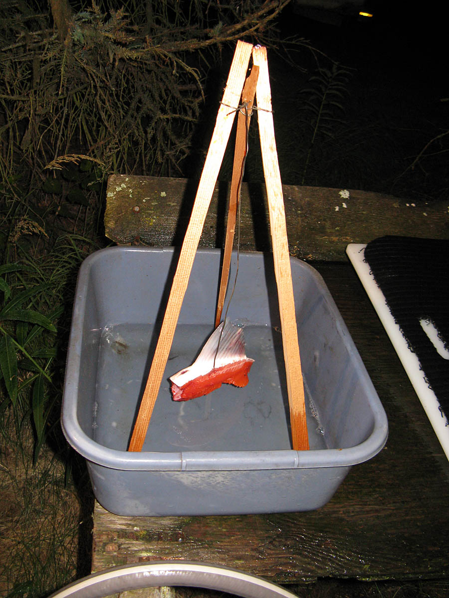 Put the trap on a table or other high area outside so that kids and pets will not be able to get close to it. IMPORTANT: A piece of fish with vertical sides AND SKIN ON TOP works best for having the insects fall off easier and not be able to cut meat off the top of the bait in a stable area.
